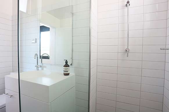 The saving grace for this room reveal is Alisa and Lysandra's ensuite. This space is bang on. Love the over sized tiles, love the basin, and I particularly love the recessed mirror cabinets! One of the worst things about bathroom storage, is the inability to stand up bottles of hairspray, deodorant etc. The girls have addressed this in spades! The textured white feature tile in the shower is just gorgeous, and helps to bounce shimmery light around the room. Kudos too for addressing the sometimes ugly extraction fan issue, by inserting it into a bulkhead above the shower head.